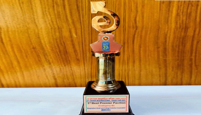 নিজস্ব প্রতিবেদক : ২৭ তম ঢাকা আন্তর্জাতিক বাণিজ্য মেলা ২০২৩-এ অংশগ্রহণ করে বিসিক প্রিমিয়ার প্যাভিলিয়ন B- ক্যাটাগরীতে “৩য় বেস্ট প্রিমিয়ার প্যাভিলিয়ন” ট্রফি অর্জন করেছে।