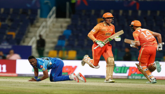 শেষ ওভারে জর্ডান থম্পসনের চমৎকার বোলিংয়ে কোণঠাসা ছিল গালফ। শেষ বলে দরকার ছিল ৩ রান, শিমরন হেটমায়ার ডিপ মিডউইকেট দিয়ে ছক্কা মেরে দলকে জেতান। ৫ উইকেটে ১৪৩ রান করে তারা।