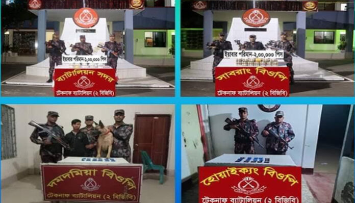 বিজিবি’র টেকনাফ ব্যাটালিয়নের সাবরাং বিওপি’র সদস্যরা বৃহস্পতিবার (২ ফেব্রুয়ারি) নাফনদী তীরে অভিযান চালিয়ে মিয়ানমার থেকে বাংলাদেশে পাচারকালে এ পরিমাণ ইয়াবা উদ্ধার করে। এ সময় বিজিবির ধাওয়ার মুখে তিনজন পাচারকারী পালিয়ে যেতে সক্ষম হয়।