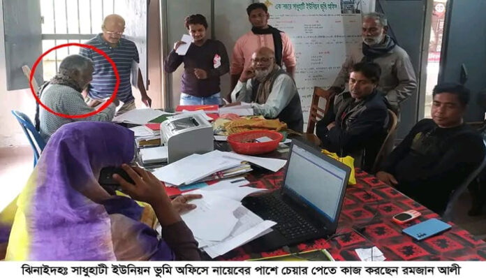 আতিকুর রহমান, ঝিনাইদহ প্রতিনিধি: নাম রমজান আলী। ঝিনাইদহ সদর উপজেলার সাধুহাটি ইউনিয়ন ভূমি অফিসে কাজ করেন। তবে তিনি কোন সরকারী কর্মচারী নয়। খন্ডকালীন তাকে কেউ নিয়োগও দেননি। রমজান আলী উপ-সহকারী ভুমি কর্মকর্তার পাশে চেয়ারে বসে কাজ করেন। ভূমি অফিসের গুরুত্বপূর্ণ নথি তিনি ঘাটাঘাটি করেন। অনেকের গুরুত্বপূর্ণ কাগজ টেম্পারিং করে সর্বনাশও করেছেন এই রমজান। বিনিময়ে কৃষকদের কাছ থেকে হাতিয়ে নিচ্ছেন কাড়ি কাড়ি টাকা।
