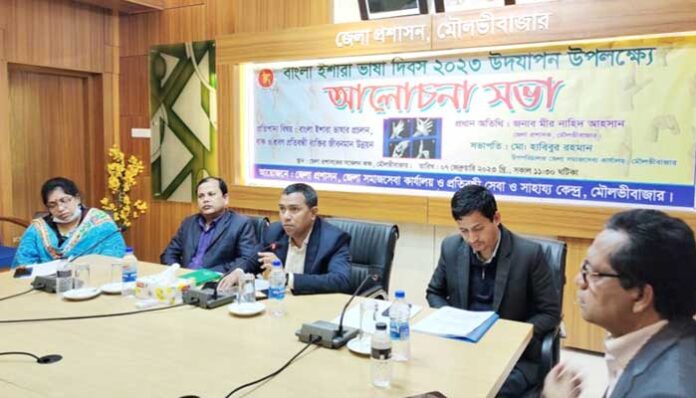 তিমির বনিক, ষ্টাফ রিপোর্টার: বাংলা ইশারা ভাষার প্রচলন, বাক-শ্রবণ প্রতিবন্ধী ব্যক্তির জীবন মান উন্নয়ন’ এই প্রতিপাদ্য নিয়ে মৌলভীবাজারে বাংলা ইশারা ভাষা দিবস পালিত হয়েছে। মঙ্গলবার (৭ ফেব্রুয়ারি) দিবসটি উদযাপন উপলক্ষে মৌলভীবাজার জেলা প্রশাসন ও সমাজসেবা অধিদপ্তর প্রতিবন্দী সেবা ও সাহায্য কেন্দ্রের আয়োজনে জেলা প্রশাসকের সম্মেলন কক্ষে আলোচনা সভা অনুষ্ঠিত হয় । আলোচনা সভায় সমাজ সেবা অধিদপ্তরের উপ-পরিচালক মো. হাবিবুর রহমান সভাপতিত্বে প্রধান অতিথি ছিলেন জেলা প্রশাসক মীর নাহিদ আহ্সান। অতিথি ছিলেন অতিরিক্ত জেলা প্রশাসক (সার্বিক) প্রভাংশু সোম মহান, ভারপ্রাপ্ত সিভিল সার্জন ডা.বর্নালী পাল, জেলা শিশুবিষয়ক কর্মকর্তা জসীম উদ্দিন মাসুদ, সমাজ সেবা বিভাগের কর্মকর্তা-কর্মচারী ও দৃষ্টি প্রতিবন্ধী শিক্ষার্থীরা উপস্থিত ছিলেন। অনুষ্ঠানে স্বাগত বক্তব্য রাখেন জেলা প্রতিবন্দী বিষয়ক কর্মকর্তা চন্দন কুমার পাল।