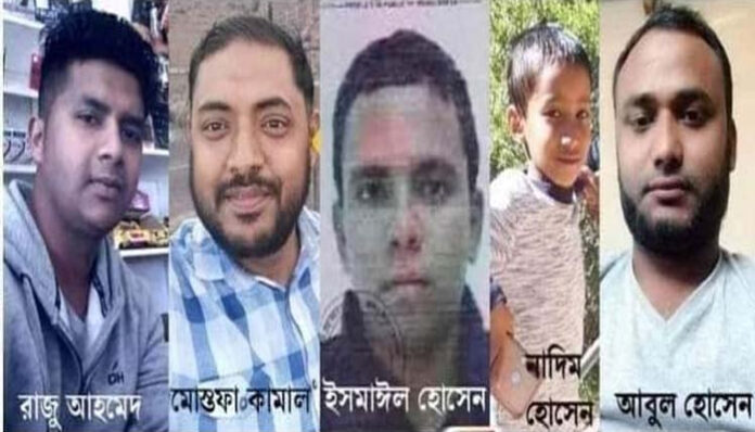 নিহতরা হলেন- ফেনী সদর উপজেলার পাঁচগাছিয়া ইউনিয়নের বিরলী গ্রামের শরিয়ত উল্লাহর ছেলে ইসমাইল হোসেন (৩২), দাগনভূঞা উপজেলার দক্ষিণ নেয়াজপুর গ্রামের রাজু আহমেদ (৩৪), একই উপজেলার মাতুভূঁঞা ইউনিয়নের মমারিজপুরের মো. মোস্তফা (৪০), সোনাগাজী উপজেলার চর মজলিশপুরের আবুল হোসেন (৪৫) ও নাদিম হোসেন (১০)।
