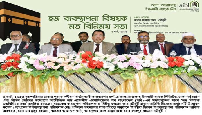 কর্পোরেট সংবাদ ডেস্ক: ২ মার্চ, ২০২৩ বৃহস্পতিবার ঢাকার পুরানা পল্টনে ‘বার্ডস আই কনভেনশন হল’-এ আল-আরাফাহ্ ইসলামী ব্যাংক লিমিটেড-ঢাকা নর্থ জোন এবং সাউথ জোনের উদ্যোগে আয়োজিত হজ এজেন্সীস এসোসিয়েশন অব বাংলাদেশ (হাব)-এর সদস্যবৃন্দের সাথে ‘হজ বিষয়ক মতবিনিময় সভা’ অনুষ্ঠিত হয়েছে। ব্যাংকের ব্যবস্থাপনা পরিচালক ও সিইও ফরমান আর চৌধুরী প্রধান অতিথি হিসেবে অনুষ্ঠানটি উদ্বোধন করেন। ব্যাংকের উপব্যবস্থাপনা পরিচালক মোঃ শফিকুর রহমানের সভাপতিত্বে অনুষ্ঠানে উপস্থিত ছিলেন উপব্যবস্থাপনা পরিচালক শাব্বির আহমেদ, মোঃ মাহমুদুর রহমান, আবেদ আহাম্মদ খান, আবদুল্লাহ আল মামুন এবং মোঃ ফজলুর রহমান চৌধুরী।
