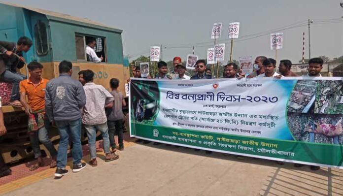 তিমির বনিক, ষ্টাফ রিপোর্টার: মৌলভীবাজারের কমলগঞ্জ উপজেলার লাউয়াছড়া জাতীয় উদ্যানের ভেতর দিয়ে ট্রেন চলাচলের সময় গতি সর্ব্বোচ্চ ২০ কি.মি. রাখার সিদ্ধান্ত কার্যকরের জন্য সচেতনতা কর্মসূচী পালিত হয়েছে। বিশ্ব বন্যপ্রাণী দিবস-২০২৩ উদযাপন উপলক্ষে ব্যতিক্রমী এ কর্মসূচী পালন করে মৌলভীবাজারের বন্যপ্রাণী ব্যবস্থাপনা ও প্রকৃতি সংরক্ষণ বিভাগ। শুক্রবার সকাল সাড়ে ৯টা থেকে শ্রীমঙ্গল ও ভানুগাছ রেলওয়ে স্টেশনে এ কর্মসূচী পালিত হয়।বনবিভাগ সূত্রের বরাতে জানা যায়, কমলগঞ্জ উপজেলার লাউয়াছড়া জাতীয় উদ্যানের ভেতর দিয়ে সিলেটের সাথে ঢাকা ও চট্রগ্রাম রেলপথে দ্রুতগামী ট্রেন চলাচলের সময় নানা প্রজাতির বন্যপ্রাণি কাঁটা পড়ে মারা যায়। সেজন্য জাতীয় লাউয়াছড়া বনের মাঝ দিয়ে রেলপথে বন্যপ্রাণী মারা যাওয়ার বিষয়ে যুক্তি তুলে ধরে বনাঞ্চল এলাকায় ট্রেনের গতি ২০-৩০ কিলোমিটারের রাখার বিষয়ে গত বছরের ২৭ ফেব্রুয়ারী বন্যপ্রাণী ও প্রকৃতি সংরক্ষণ বিভাগ বন সংরক্ষকের কাছে পত্র প্রেরণ করেন মৌলভীবাজারস্থ বন্যপ্রাণী ব্যবস্থাপনা ও প্রকৃতি সংরক্ষণ বিভাগের বিভাগীয় বন কর্মকর্তা মো. রেজাউল করিম চৌধুরী।