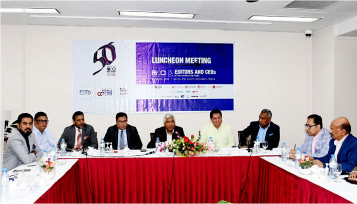 শনিবার রাজধানীর একটি হোটেলে সংবাদপত্র ও টেলিভিশনের সম্পাদক এবং প্রধান নির্বাহীদের সম্মানে আয়োজিত এক মধ্যাহ্নভোজ সভায় গণমাধ্যামের প্রতি সহযোগিতার আহ্বান জানান এফবিসিসিআই সভাপতি মোঃ জসিম উদ্দিন।