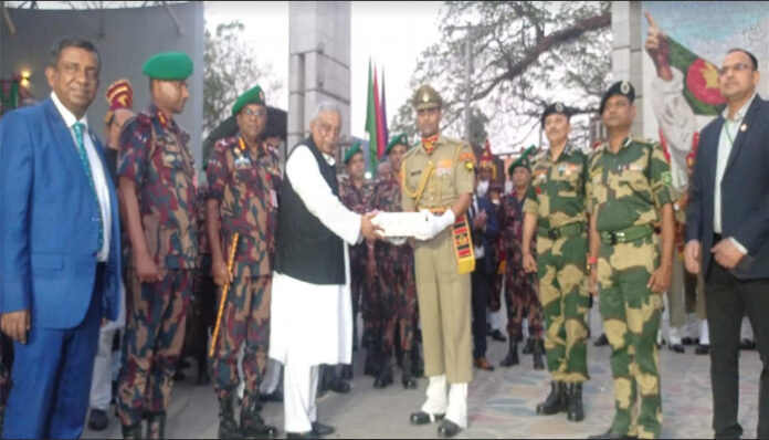 বেনাপোল প্রতিনিধি : যশোরের বেনাপোল নোমান্সল্যান্ড বাংলাদেশ ও ভারতের সীমান্তরক্ষী বাহিনী বিজিবি-বিএসএফ কর্তৃক জয়েন্ট রিট্রিট সিরিমনি প্যারেড অনুষ্ঠিত হয়েছে।স্বরাষ্ট্রমন্ত্রী আসাদুজ্জামান খান, এমপি উপস্থিত থেকে জমকালো ও মনোমুগ্ধকর এই প্যারেডটি উপভোগ করেন।