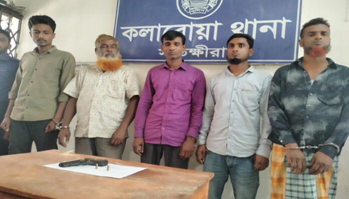 আটককৃতরা হলেন, যশোর জেলার ঝিকরগাছা উপজেলার হাজির আলী এলাকার বশির’র ছেলে হুমায়ুন কবির (৩৭), কোতয়ালী থানার মেল্ল্যাপাড়া গ্রামের ফজর আলী উকিলের ছেলে সাইদুল ইসলাম (৬০), ধলামিয়ার ছেলে মিজান (৪৭), শার্শা থানার বসতপুর গ্রামের আব্দুল ওহাব এর পুত্র আবুল কালাম(৫৫), একই গ্রামের নুর মোহাম্মাদের ছেলে আব্দুল্লাহ, সাতক্ষীরা সদরের মধ্যকাটিয়া গ্রামের শেখ আব্দুল হামিদের পুত্র সাইদুজ্জামান(২৮)। ঘটনাস্থল থেকে একটি পিস্তল ও দুই রাইন্ড গুলি এবং দুটি প্রাইভেটকার জব্দ করা হয়েছে।