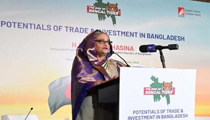 সোমবার (৬ মার্চ) কাতারের রাজধানীতে অনুষ্ঠিত দোহা ইনভেস্টমেন্ট সামিট ২০২৩ “দ্য রাইজ অব বেঙ্গল টাইগার: পটেনশিয়ালস অফ ট্রেড অ্যান্ড ইনভেস্টমেন্ট ইন বাংলাদেশ” এ ভাষণে এ কথা বলেন প্রধানমন্ত্রী। তিনি কাতারের ব্যবসায়ীদের বাংলাদেশের কিছু থ্রাস্ট সেক্টরের দিকে নজর দেয়ার পরামর্শ দেন। কারণ তার সরকার অবকাঠামো ও লজিস্টিক খাত বিনিয়োগের জন্য উন্মুক্ত রেখেছে।