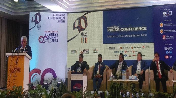 সোমবার (১৩ মার্চ) রাজধানীর শেরেবাংলা নগরের বঙ্গবন্ধু আন্তর্জাতিক সম্মেলন কেন্দ্রে (বিআইসিসি) ৩ দিনব্যাপী বাংলাদেশ বিজনেস সামিট ২০২৩ এর সমাপনী অনুষ্ঠানে দেশের ব্যবসায়ীদের শীর্ষ সংগঠন দি ফেডারেশন অব বাংলাদেশ চেম্বার্স অব কমার্স অ্যান্ড ইন্ডাস্ট্রিজের (এফবিসিসিআই) সভাপতি জসিম উদ্দিন এসব কথা জানান।