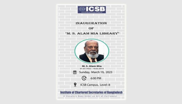 The Institute of Chartered Secretaries of Bangladesh (ICSB) is going to inaugurate its refurbished library in the name of Late M. S. Alam Mia FCS (F-0002). On This occasion, The Institute will organize an inaugural session of library and discussion and `Doa Mahfil’ to be held at the ICSB Campus on Sunday, March 19, 2023 at 6.00 PM.