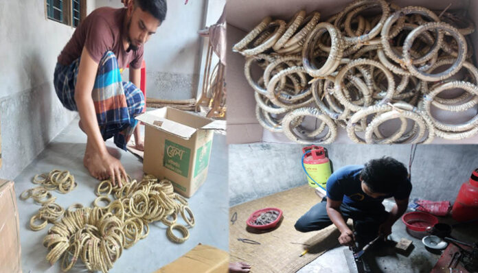 একই গ্রামের সাইফুল সরদার বলেন, আগে মাছের ব্যবসা করতাম করোনার সময় বাড়িতে বসে না থেকে বালা তৈরির কাজ শিখেছিলাম। আমার স্ত্রীও এই কাজ করে। বর্তমানে আমরা দুইজন মিলে দৈনিক ৩০ থেকে ৪০ জোড়া বালা তৈরি করি।