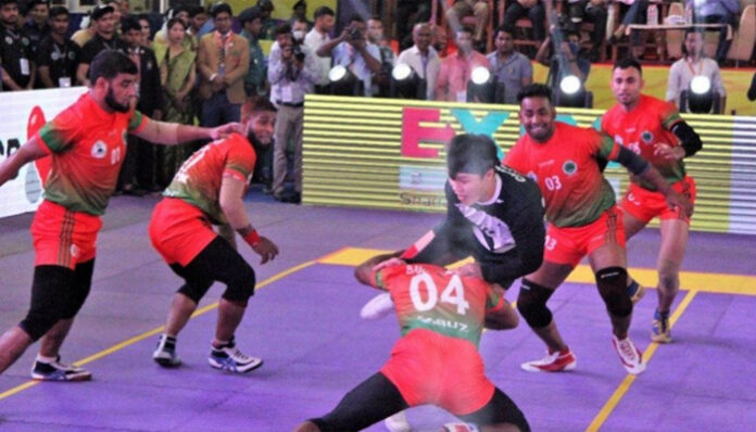 এদিন অন্যদিনের তুলনায় কিছুটা কঠিনই ছিল তুহিন তরফদারদের লড়াই। কারণ, ম্যাচের শুরুর দিকে একপর্যায়ে ৭-৬ ব্যবধানে এগিয়ে গিয়েছিল প্রতিপক্ষ দল। কিন্তু দ্রুতই ম্যাচে ফিরে স্বাগতিকরা। প্রথমার্ধ শেষে ২০-১৪ ব্যবধানের লিড নিয়ে মাঠ ছাড়ে গত দুই আসরের চ্যাম্পিয়নরা।
