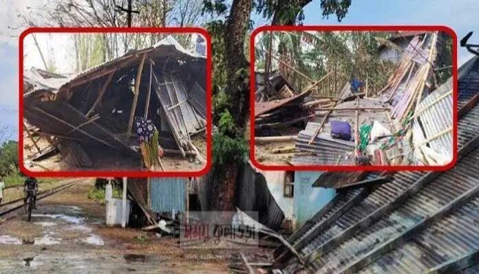 তিমির বনিক, ষ্টাফ রিপোর্টার: মৌলভীবাজারে কুলাউড়ায় আকস্মিক ঘূর্ণিঝড় ও শিলাবৃষ্টিতে ব্যাপক ক্ষয়ক্ষতি সাধিত হয়েছে। আজ মঙ্গলবার (২১ মার্চ) দুপুরে আকস্মিকভাবে কুলাউড়া উপজেলার উপর দিয়ে বয়ে যাওয়া অর্ধঘন্টাব্যাপী ঘূর্ণিঝড় ও শিলাবৃষ্টিতে শতাধিক ঘরবাড়িসহ গাছপালার ব্যাপক ক্ষয়ক্ষতি সাধিত হয়েছে।ঘূর্ণিঝড়ে উপজেলার সদর, পৃথিমপাশা, টিলাগাঁওসহ বিভিন্ন ইউনিয়নে লন্ডভন্ড হয়ে গেছে ঘরবাড়ি ও দোকানপাট।জানা যায়, মঙ্গলবার (২১ মার্চ) দুপুর ১টার দিকে কুলাউড়ায় আকস্মিক ঝড় শুরু হয়। ঝড়ে উপজেলার টিলাগাঁও ইউনিয়ন এলাকায় ব্যাপক ক্ষয়ক্ষতি হয়। ঘূর্ণিঝড়ে টিলাগাঁও রেলস্টেশনের ঘরের টিন ও বিভিন্ন ইউনিয়নের প্রায় এলাকার বাড়িঘর ও দোকানপাট বিধ্বস্ত হয়ে যায়।