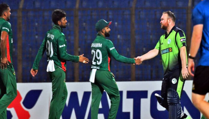 বৃষ্টি আইনে ৮ ওভারে ১০৪ রানের টার্গেট পায় আয়ারল্যান্ড। ব্যাট হাতে ঝড়ো গতিতে আইরিশ দুই ওপেনার অধিনায়ক পল স্টার্লিং ও রস অ্যাডায়ার ১৬ বলে ৩২ রান তোলেন। অ্যাডায়ারকে ১৩ রানে বোল্ড করে জুটি ভাঙ্গেন পেসার হাসান মাহমুদ।