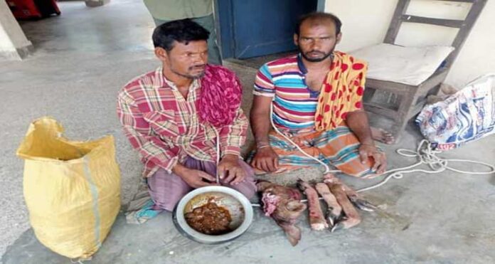 শহীদুজ্জামান শিমুল, সাতক্ষীরা : সুন্দরবন সাতক্ষীরা রেঞ্জের সাপখালী খাল থেকে দুই চোরা শিকারীকে আটক করেছে বনবিভাগের সদস্যরা।এ সময় তাদের কাছে থেকে হরিণের রান্না করা মাংস ,১টি মাথা, ৪টি পা ও ১বস্তা হরিণ শিকারের কাজে ব্যবহৃত ফাঁসের জাল উদ্ধার করা হয়।বৃহস্পতিবার (৩০ মার্চ) ভোর রাতে সুন্দরবনের সাপ খালী খাল থেকে তাদেরকে আটক করা হয়।আটককৃতরা হলেন, শ্যামনগর উপজেলার গাবুরা পাশ্বামারী গ্রামের মৃত বেলায়েত গাজীর ছেলে মজিবার (৫২) ও কুদ্দুস শেখের ছেলে ময়নদ্দিন(৪০)