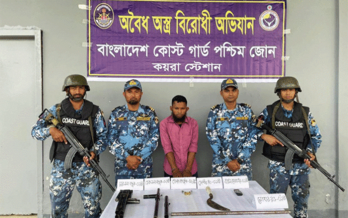 সাতক্ষীরা প্রতিনিধি : সাতক্ষীরার শ্যামনগরে কোস্ট গার্ডের অভিযানে দুটি একনলা বন্দুক, একটি চারনলা বন্দুক, দুই রাউন্ড তাজা কার্তুজ ও একটি দাঁসহ এক ডাকাতকে আটক করা হয়েছে।