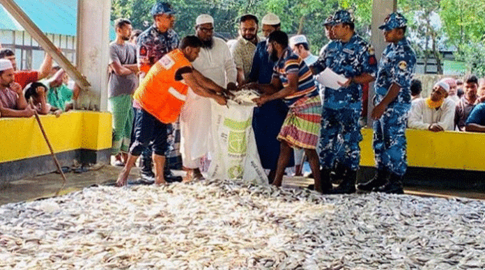 কমান্ডার মুনিফ তকি জানান, একটি ইঞ্জিন চালিত স্টিল বডি ট্রলার তল্লাশি করে ১৫০ মণ জাটকা ইলিশ জব্দ করা হয়েছে। পরে মৎস্য কর্মকর্তার উপস্থিতিতে জব্দকৃত মাছ স্থানীয় ১৭টি এতিমখানা ও স্থানীয় দুঃস্থদের মধ্যে বিতরণ করা হয়।