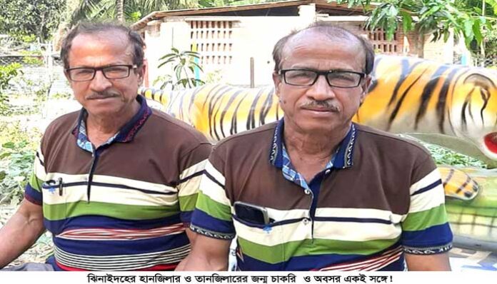 আতিকুর রহমান, ঝিনাইদহ প্রতিনিধি: একসঙ্গে জন্ম। একসঙ্গে চাকরী। আবার অবসরও একই সঙ্গে। শুনতে অবিশ্বাস্য হলেও হানজিলার রহমান ওরফে ঠান্ডু মিয়া ও তানজিলার রহমান ওরফে মন্টু মিয়ার জীবনে এমনই ঘটেছে। তারা যমজ দুই ভাই। জন্মের ব্যবধান মাত্র ১০ মিনিটের। একত্রে বেড়ে ওঠা দুই যমজ ভাই পড়ালেখাও করেছেন একই সঙ্গে। পড়ালেখা শেষে চাকরিও পেয়েছেন একই চিঠিতে। কর্মস্থলেও যোগ দিয়েছেন একই দিনে। অবসরের ক্ষেত্রেও তাই।