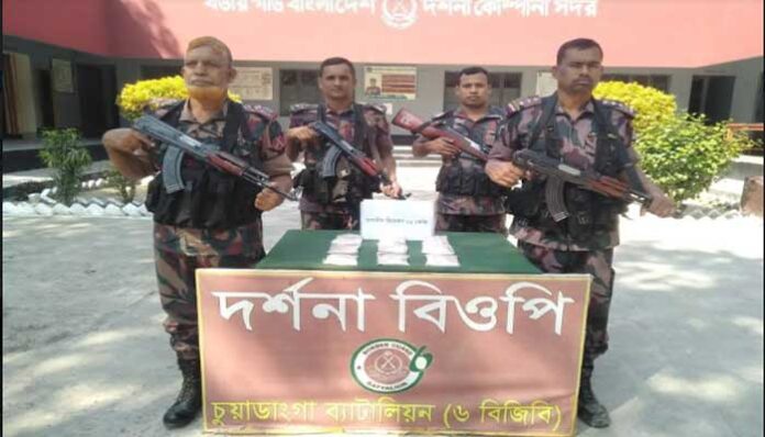 চুয়াডাঙ্গা বিজিবি-৬’র পরিচালক অধিনায়ক লেঃ কর্ণেল সাঈদ মোহাম্মদ জাহিদুর রহমান এক প্রেস বিজ্ঞপ্তিতে জানান, চুয়াডাঙ্গার দর্শনা রেল ষ্টেশন হয়ে চাপাইনবাবগঞ্জ হতে খুলনা অভিমূখী ছেড়ে আসা মহানন্দা ট্রেনে ভারতীয় হিরোইন পাচার করা হবে এমন গোপণ সংবাদের ভিত্তিতে সোমবার দুপুরে দর্শনা বিওপি কমান্ডার সুবেদার নওশের আলী সঙ্গীয় ফোর্স নিয়ে দর্শনা রেলস্টেশনে অভিযান চালায়। ট্রেনটি দর্শনা রেলস্টেশনে থামলে দ্বিতীয় বগি তল্লাশি চালিয়ে এক কেজি হিরোইন উদ্ধার করা হয়।