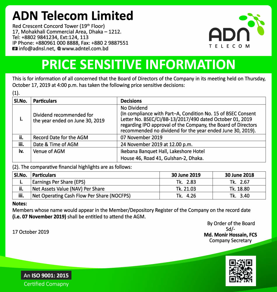 Homeপ্রাইস সেনসিটিভ ইনফরমেশনPrice Sensitive Information of ADN Telecom Limited