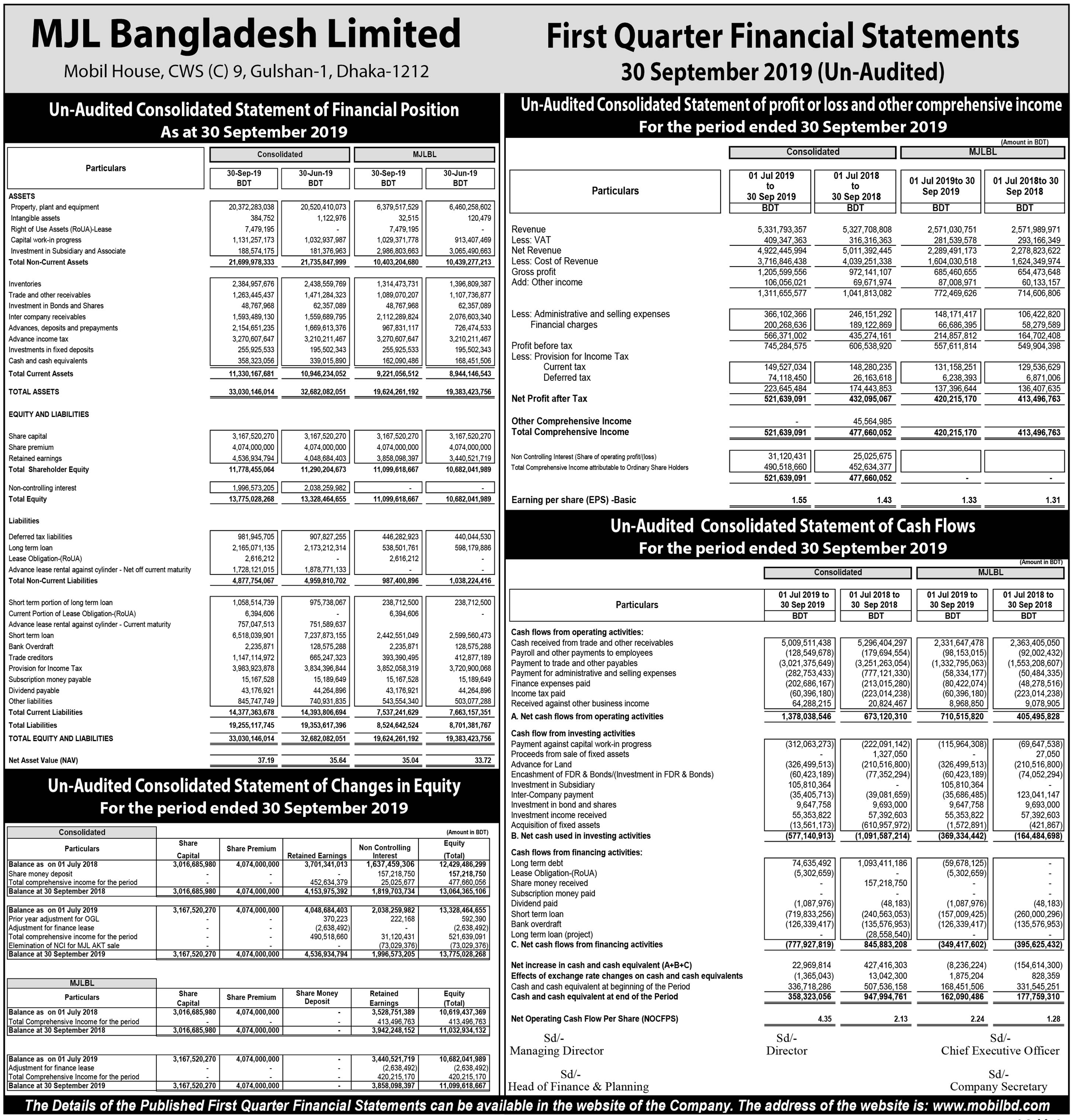 Homeপ্রাইস সেনসিটিভ ইনফরমেশনFirst Quarter Financial Statements 30 September 2019 (Un-Audited) of MJL Bangladesh Ltd.