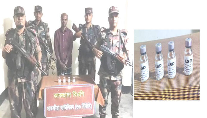 বুধবার(২৬ এপ্রিল) সকালে এক প্রেস ব্রিফিংয়ে এই তথ্য জানান বিজিবি-৩৩ ব্যাটালিয়নের অধিনায়ক লেঃ কর্নেল মোঃ আশরাফুল হক জানান, গোপন সংবাদের ভিত্তিতে সুবেদার মো.আবু তাহের পাটোয়ারির নেতৃত্বে কেড়াগাঁছি গ্রামে অভিযান চালিয়ে ৪ বোতল নিষিদ্ধ মাদকসহ ওই আসামীকে আটক করা হয়। প্রতি বোতলে ৫০ মিলি এলএসডি থাকে।