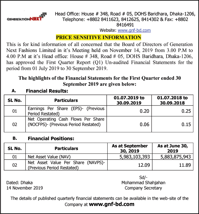Homeপ্রাইস সেনসিটিভ ইনফরমেশনPrice Sensitive Information of Generation Next Fashions Ltd.