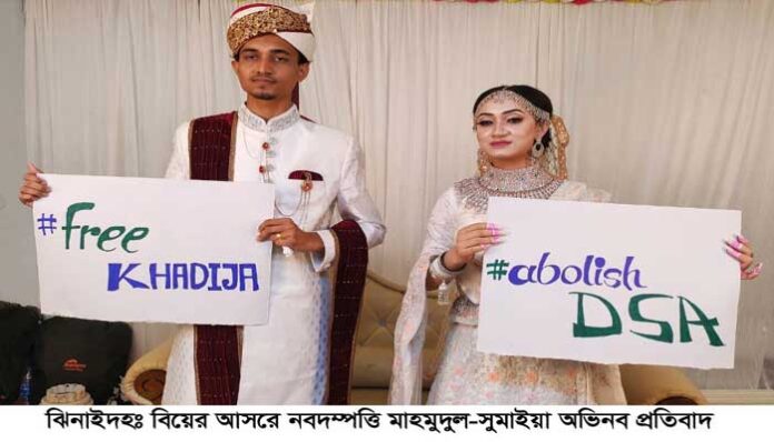 তথ্য নিয়ে জানা গেছে, ঝিনাইদহ সদর উপজেলার নারিকেলবাড়িয়া গ্রামের রেজাউল ইসলামের ছেলে মাহমুদুল ইসলাম জাহাঙ্গীরনগর বিশ্ববিদ্যালয়ের ভূগোল ও পরিবেশ বিদ্যা বিভাগের শিক্ষার্থী। তিনি আবার ছাত্র ইউনিয়নের দপ্তর সম্পাদক। সুমাইয়া আফরিন একই উপজেলার গান্না ইউনিয়নের চন্ডিপুর গ্রামের খলিলুর রহমানের মেয়ে। তিনি বরিশাল বিশ্ববিদ্যালয়ের শিক্ষার্থী। গত মঙ্গলবার (২৫ এপ্রিল) ঝিনাইদহ শহরের পাগলাকানাই এলাকার প্রফেসর কমিউনিটি সেন্টারে তাদের বিয়ে হয়। বিয়ের আসরেই নবদিম্পত্তি ডিজিটাল নিরাপত্তা আইন বাতিল সম্বলিত প্লাকার্ড প্রদর্শন করে হৈ চৈ ফেলে দেন। মাহমুদুলের হাতে ‘ফ্রি খাদিজা’ ও সুমাইয়ার হাতে ‘এ্যবলিশ ডিএসএ’ লেখা প্লাকার্ড শোভা পায়। বিয়ের আসরেই অভিনব কায়দায় প্রতিবাদ জানিয়ে মাহমুদুল-সুমাইয়া নতুন দাম্পত্য জীবন শুরুর পক্রিয়াকে অনেকেই ব্যতিক্রম বলে মনে করছেন। বিয়ের আসরে নবদম্পতির সহকর্মীরাও ডিজিটাল নিরাপত্তা আইন বাতিলের দাবিতে সেদিন শ্লোগান দেন।