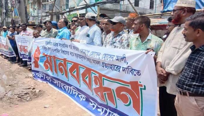 শহীদুজ্জামান শিমুল, সাতক্ষীরা প্রতিনিধি : সাতক্ষীরায় কর্মরত ৫ সাংবাদিকের নামে ষড়যন্ত্রমূলক মিথ্যা মামলার প্রতিবাদে মানববন্ধন করেছে সাংবাদিকরা।
