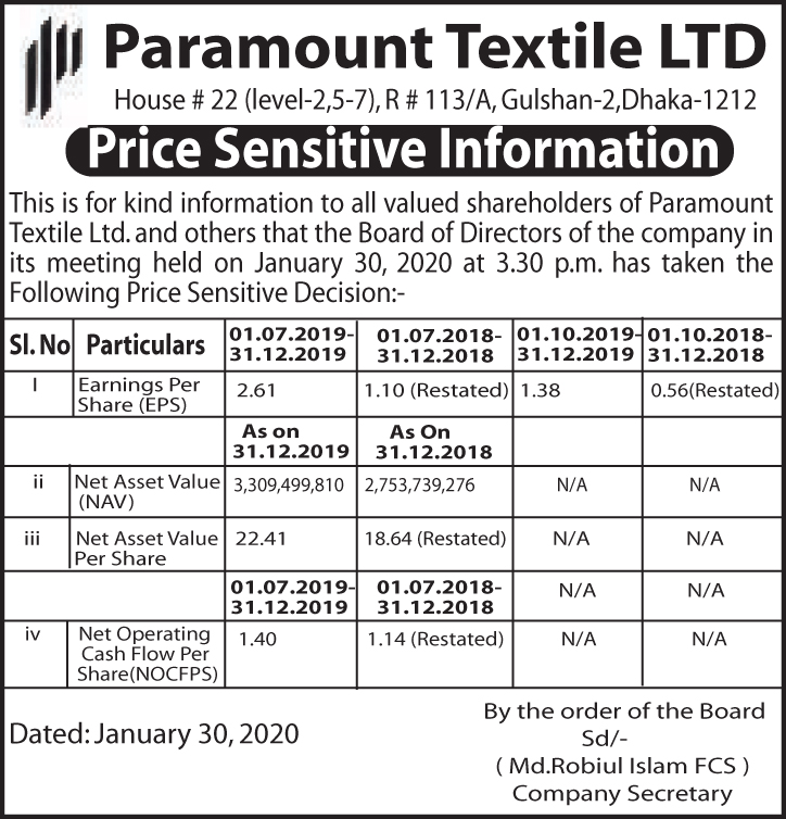 Homeপ্রাইস সেনসিটিভ ইনফরমেশনPSI & Statement of Financial Position (Un-Audited) of Paramount Textile Ltd.