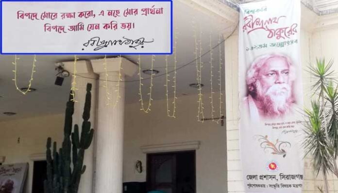 সেলিম রেজা, সিরাজগঞ্জ প্রতিনিধি: সিরাজগঞ্জ শাহজাদপুরে তিন দিনব্যাপি রবীন্দ্র জন্মজয়ন্তী অনুষ্ঠানে রবিন্দ্রকাছারি বাড়ীতে গীতাঞ্জলি কাব্যগ্রন্থের “বিপদে মোরে রক্ষা করো” কবিতাটি ভুল লেখাসংবলিত ফেস্টুনটি রবিন্দ্র অডিটোরিয়ামের প্রধান ফটকে টানিয়ে তিন দিনব্যাপি অনুষ্ঠান চললেও নজরে আসেনি প্রশাসনের।