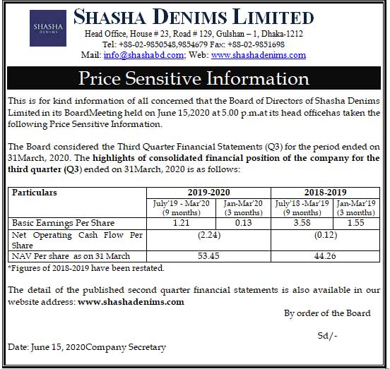 Homeপ্রাইস সেনসিটিভ ইনফরমেশনPrice Sensitive Information of Shasha Denims Limited
