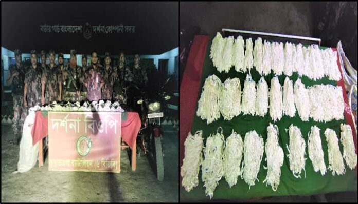 প্রেস বিজ্ঞপ্তিতে আরও জানা গেছে, বুধবার দুপুরে দর্শনার বাড়াদি ক্যাম্পের বিজিবি টহলদল স্থানীয় নাস্তিপুর কবরস্থান রোডে সন্দেহজনক এক বোরকা পরিহিত শাহানারা বেগম নামের এক নারীর দেহে তল্লাশি চালিয়ে ২০টি স্বর্ণের বারসহ (২ কেজি ৩৪১ গ্রাম) তাকে আটক করে।