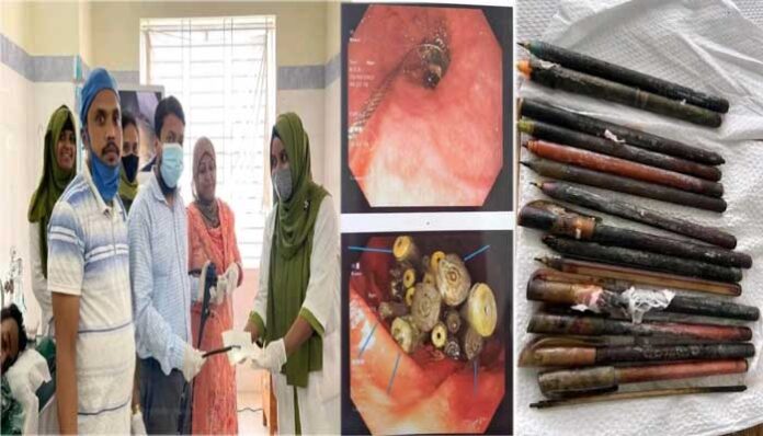 সেলিম রেজা, সিরাজগঞ্জ প্রতিনিধি: সিরাজগঞ্জের শাহজাদপুরে এন্ডোস্কপির মাধ্যমে মোতালেব হোসেন (৩৮) নামের এক যুবকের পেট থেকে ১৫টি কলম বের করেছেন চিকিৎসক। তাঁর পেটে আরও চার-পাঁচটি কলম রয়েছে।