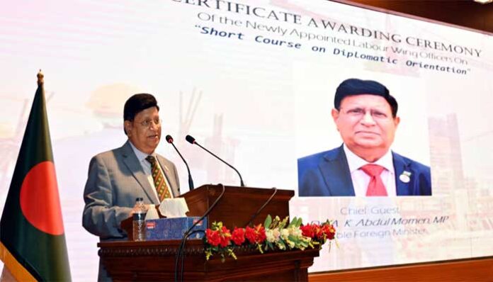 সোমবার (২৯ মে) রাজধানীর ফরেন সার্ভিস একাডেমিতে বিদেশের বাংলাদেশ মিশনের লেবার উইংয়ে নবনিযুক্ত কর্মকর্তাদের ‘ডিপ্লোমেটিক ওরিয়েন্টেশন’ কোর্সের সার্টিফিকেট দেওয়ার অনুষ্ঠানে প্রধান অতিথির বক্তব্যে এ কথা বলেন পররাষ্ট্রমন্ত্রী।