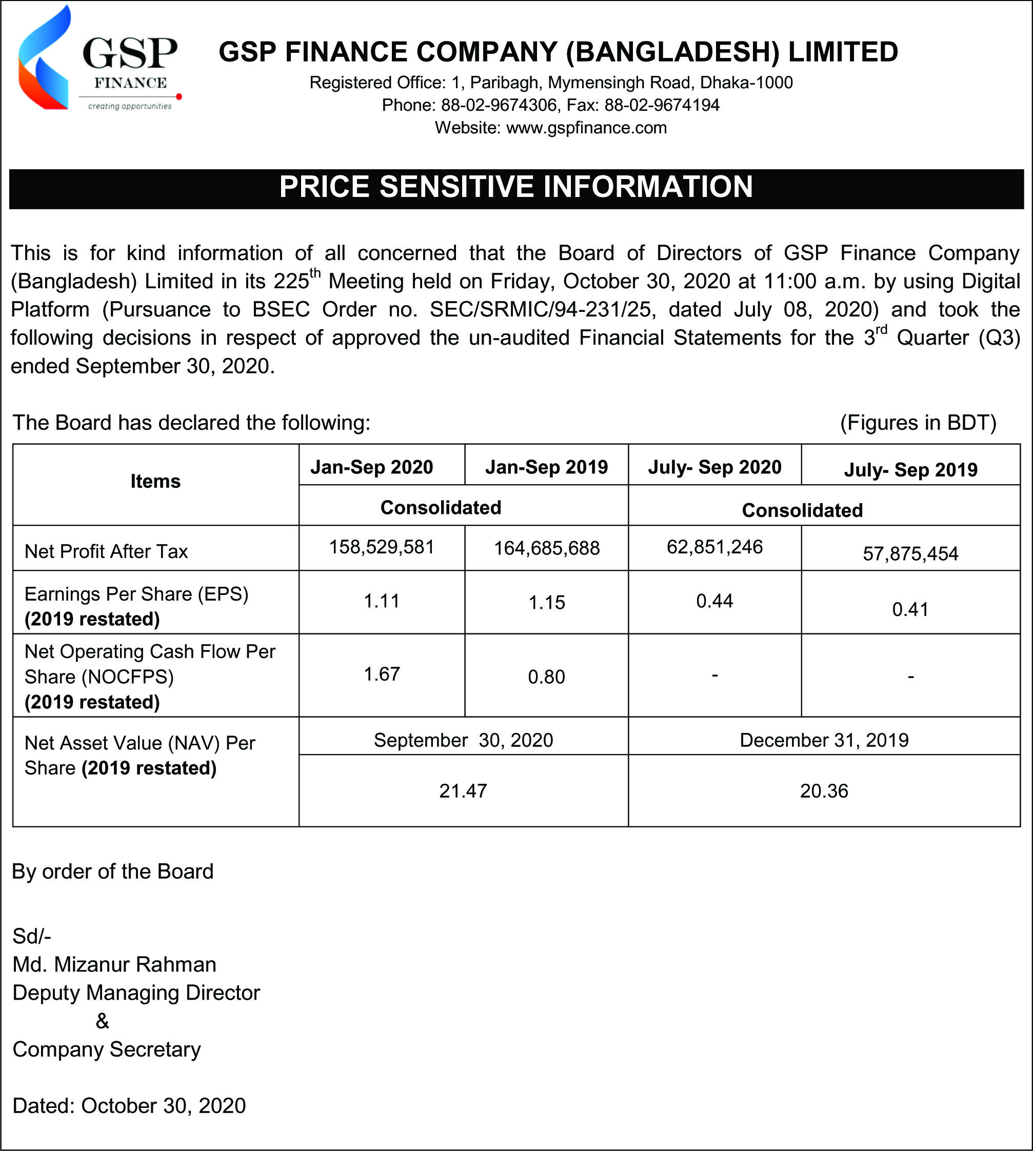 Price Sensitive Information of GSP Finance Company (Bangladesh) Ltd.