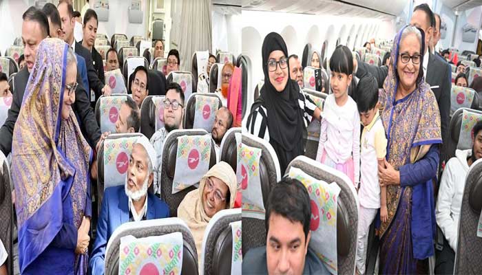 শেখ হাসিনা জাতীয় পতাকাবাহী বিমানের বাণিজ্যিক ফ্লাইটে পরিপূর্ণ যাত্রীদের সাথে কথা বলেন।