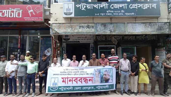 পটুয়াখালী প্রতিনিধি: সাংবাদিক গোলাম রাব্বানী নাদিম হত্যার প্রতিবাদ ও দোষীদের দৃষ্টান্তমূলক শাস্তির দাবিতে পটুয়াখালীতে মানববন্ধন ও বিক্ষোভ কর্মসূচি অনুষ্ঠিত হয়েছে।