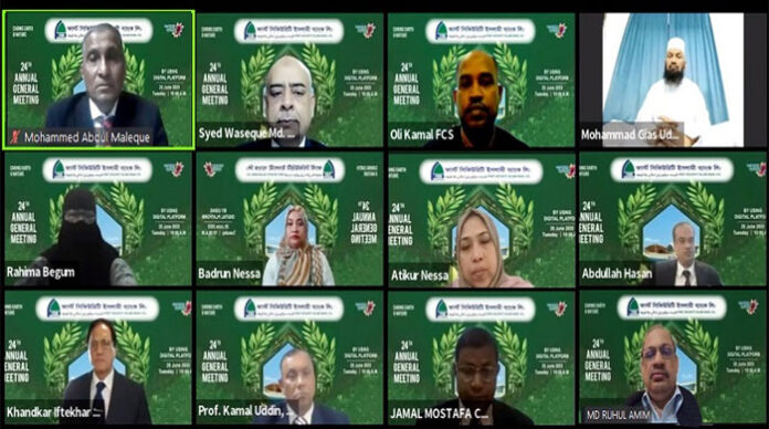 নিজস্ব প্রতিবেদক : পুঁজিবাজারে তালিকাভূক্ত কোম্পানি ফার্স্ট সিকিউরিটি ইসলামী ব্যাংক লিমিটেডের ২৪তম বার্ষিক সাধারণ সভা (এজিএম) মঙ্গলবার (২০ জুন) সকাল ১০টায় ডিজিটাল প্লাটফর্মে অনুষ্ঠিত হয়েছে।