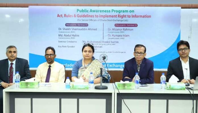 মঙ্গলবার (২০ জুন) পুঁজিবাজার সংশ্লিষ্ট প্রতিষ্ঠানগুলোকে তথ্য অধিকার আইন ও এর সাথে সম্পর্কিত নানা বিষয়ে সচেতন ও অবগত করার লক্ষ্যে বাংলাদেশ সিকিউরিটিজ অ্যান্ড এক্সচেঞ্জ কমিশন (বিএসইসি)’র উদ্যোগে ঢাকা স্টক এক্সচেঞ্জ লিমিটেড এর ট্রেনিং একাডেমিতে ‘Public Awareness Program on Act, Rules & Guidelines of Right to Information’ শীর্ষক সেমিনার অনুষ্ঠিত হয়।