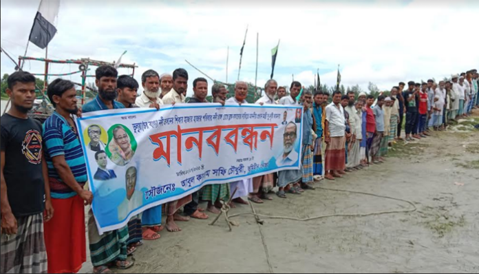 মানববন্ধনে বক্তব্য রাখেন, ভূমিহীন নেতা আবুল কালাম সফি চৌধুরী, মোহাম্মদ হাশেম, নুরল আমিন প্রমূখ। এ সময় বক্তারা, দ্রুত ব্লক দিয়ে নদী ভাঙ্গন রোধে ব্যবস্থা নেওয়ার দাবি জানিয়েছেন প্রধানমন্ত্রী শেখ হাসিনা, স্থানীয় জনপ্রতিনিধি ও প্রশাসনের কর্মকর্তাদের কাছে।