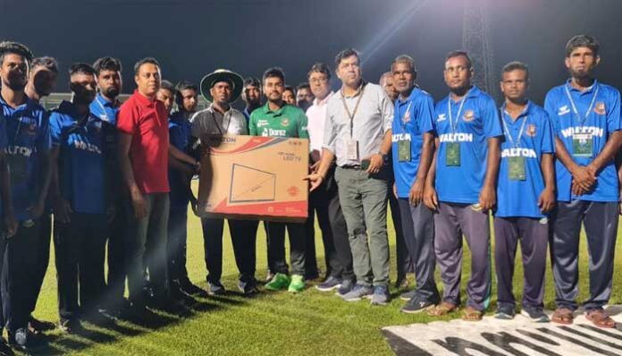 স্বাভাবিকভাবেই মাঠকর্মীদের চোখে মুখে প্রাপ্তির আনন্দ। তাদের সেই আনন্দকে আরো বাড়িয়ে তুলে বাংলাদেশ-আফগানিস্তান সিরিজের টাইটেল স্পন্সর ওয়ালটন। মাঠকর্মীদের জন্য একটি টিভি উপহার দেয় দেশের ইলেকট্রনিক্স জায়ান্ট ওয়ালটন। এই আনন্দের মাত্রা আরো বাড়িয়ে দেন মেহেদী হাসান মিরাজ। ওয়ালটনের স্পোর্টস অ্যাম্বাসেডর মিরাজ গ্রাউন্ডসম্যানদের হাতে তুলে দেন ৩২ ইঞ্চি একটি টিভি।