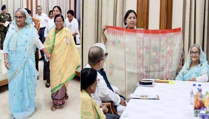 পরে প্রধানমন্ত্রী কলাগাছের আঁশ থেকে শাড়ি, গহনা ও ব্যাগ প্রস্তুতকারী দলটির সবাইকে উপহার দেন।