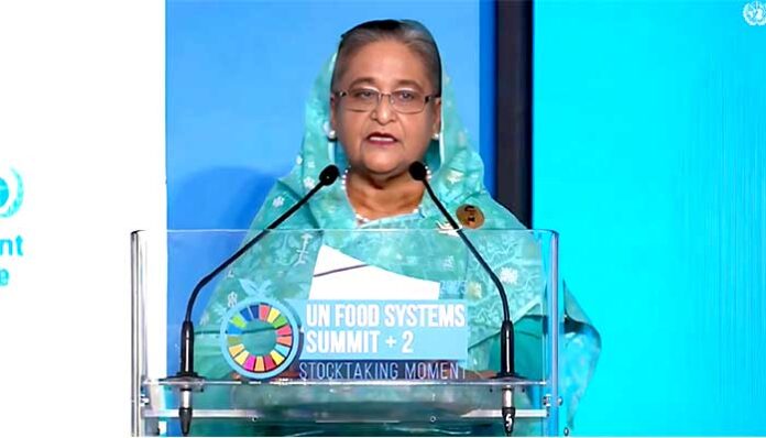 তিনি বলেন, “আমাদের জলবায়ুু-সহনশীল খাদ্য ব্যবস্থার জন্য জোট সক্রিয় করতে হবে, ২০২১ সালের জাতিসংঘ খাদ্য ব্যবস্থা শীর্ষ সম্মেলনে যার সহ-নেতৃত্ব প্রদানে বাংলাদেশ সম্মত হয়েছিল।” প্রধানমন্ত্রী এখানে এফএও সদর দফতরে জাতিসংঘ খাদ্য ব্যবস্থা সামিট + ২ স্টকটেকিং মোমেন্ট সম্মেলনে “খাদ্য ব্যবস্থা ও জলবায়ু কর্মপন্থা” বিষয়ক পূর্ণাঙ্গ অধিবেশনে তার উত্থাপিত পাঁচটি প্রস্তাবের একটিতে এটি উল্লেখ করেছেন।