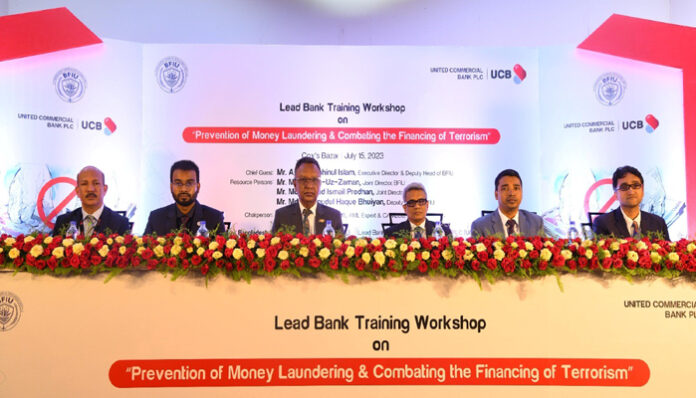 দিনব্যাপী অনুষ্ঠিত এ কর্মশালায় অ্যান্টি মানি-লন্ডারিং বিশেষজ্ঞ এবং ইউনাইটেড কমার্শিয়াল ব্যাংকের চিফ অ্যান্ট মানি লন্ডারিং কমপ্লায়েন্স অফিসার কাজী আকতারুল ইসলামের সভাপতিত্বে অনুষ্ঠিত এই প্রশিক্ষণ কর্মশালায় প্রধান অতিথি হিসেবে উপস্থিত ছিলেন বিএফআইইউর নির্বাহী পরিচালক এ এফ এম শাহিনুল ইসলাম। বিশেষজ্ঞ হিসেবে বক্তব্য রাখেন বিএফআইইউয়ের দুই যুগ্ম পরিচালক জনাব মো: রোকন-উজ-জামান, মোহাম্মদ ইসমাইল প্রধান, বিএফআইইউয়ের উপ-পরিচালক মো: মাহমুদুল হক ভূঁইয়া। স্বাগত বক্তব্য রাখেন ইউনাইটেড কমার্শিয়াল ব্যাংক পিএলসির ডেপুটি চিফ অ্যান্ট মানি লন্ডারিং কমপ্লায়েন্স অফিসার ও সিনিয়র ভাইস প্রেসিডেন্ট সাইদুর রহমান।