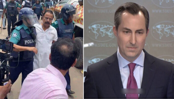 সংবাদ সম্মেলনে এক সাংবাদিক ম্যাথিউ মিলারের কাছে বাংলাদেশ জাতীয়তাবাদী দলের (বিএনপি) শীর্ষস্থানীয় নেতা গয়েশ্বর চন্দ্র রায়সহ বিরোধী নেতা-কর্মীদের ওপর হামলা এবং অবাধ ও সুষ্ঠু নির্বাচন আয়োজন নিশ্চিত করতে যুক্তরাষ্ট্র আরও কী পদক্ষেপ নিতে পারে সে প্রসঙ্গটি সামনে আনেন।