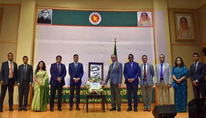 যুক্তরাষ্ট্রে নিযুক্ত বাংলাদেশের রাষ্ট্রদূত মোহাম্মদ ইমরান কর্তৃক জাতির পিতার আবক্ষ মুর্তি এবং শহিদ শেখ কামালের প্রতিকৃর্তিতে পুষ্পস্তবক অর্পণের মধ্য দিয়ে এ কর্মসূচি শুরু হয়। এসময় মিশনের কর্মকর্তা-কর্মচারীরা উপস্থিত ছিলেন।