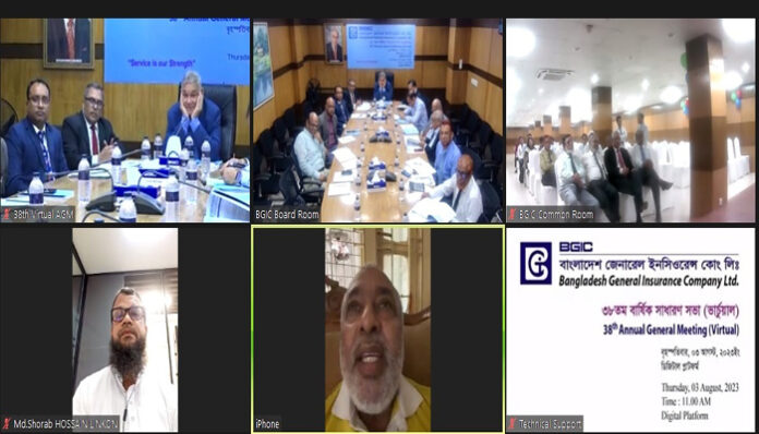 নিজস্ব প্রতিবেদক: বাংলাদেশ জেনারেল ইনসিওরেন্স কোম্পানী লিঃ (বিজিআইসি)-এর ৩৮ তম বার্ষিক সাধারণ সভা ০৩ আগস্ট ২০২৩ ইং তারিখে ভার্চুয়াল প্ল্যাটফর্মে অনুষ্ঠিত হয়। শুরুতে শেয়ারহোল্ডারসহ উপস্থিত সকলে কোম্পানীর প্রতিষ্ঠাতা এম এ সামাদসহ বিজিআইসি পরিবারের প্রয়াত অন্যান্য সদস্যদের বিদেহী আত্মার চির শান্তির জন্য দোয়া করেন। সভায় সভাপতিত্ব করেন কোম্পানীর চেয়ারম্যান জনাব তওহিদ সামাদ। অনুষ্ঠানে কোম্পানীর ব্যবস্থাপনা পরিচালক ও মুখ্য নির্বাহী কর্মকর্তা জনাব আহমেদ সাইফুদ্দীন চৌধুরীসহ বিপুল সংখ্যক শেয়ার হোল্ডার উপস্থিত ছিলেন।