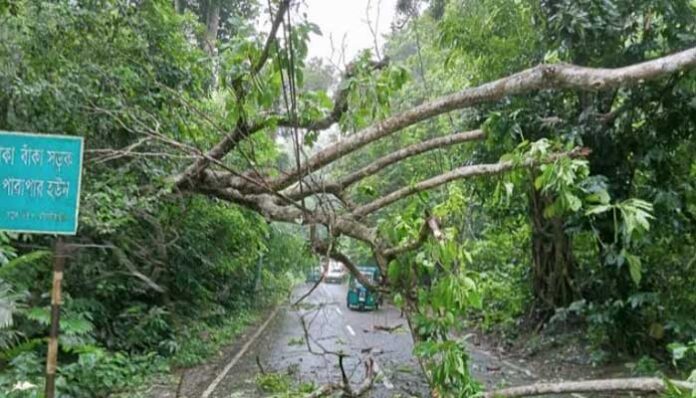 তিমির বনিক, ষ্টাফ রিপোর্টার: কয়েক দিনের টানা বৃষ্টিতে মঙ্গলবার বেলা ২টায় মৌলভীবাজারের কমলগঞ্জে উপজেলার লাউয়াছড়া জাতীয় উদ্যানে প্রবেশের প্রধান ফটক এলাকায় সড়কের ওপর একটি গাছ উপড়ে পড়েছে।