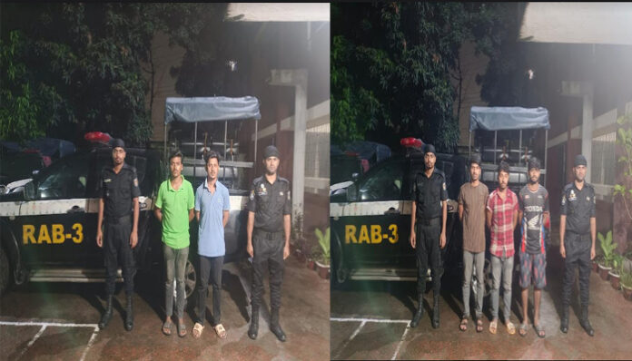 আটককৃতরা হচ্ছে- চোরচক্রের মূলহোতা ১। মোঃ নাজমুল সাকিব হামিম (২১), পিতা-মোঃ আব্বাস আলী, সাং-সস্তাপুর, থানা-ফতুল্লা, জেলা-নারায়নগঞ্জ এবং তার সহযোগী ২। মোঃ জুবায়ের আলম (১৯), পিতা-মৃত জালেনুর প্রধান, সাং-মধ্য সস্তাপুর, থানা-ফতুল্লা, জেলা-নারায়নগঞ্জ, ৩। মোঃ মোজাম্মেল হোসেন (২৩), পিতা-মোঃ জজ মিয়া, সাং-দক্ষিন ফুলদি, থানা-গজারিয়া, জেলা-মুন্সিগঞ্জ, ৪। মোঃ আব্দুল্লাহ আল শামীম (২২), পিতা-মোঃ রফিকুল ইসলাম, সাং-লাল থুতি ডাঙ্গাপাড়া, থানা-ভুল্লি, জেলা-ঠাকুরগাঁও, ৫। মোঃ হৃদয় রহমান (২৪), পিতা-মোঃ মোস্তাফিজুর রহমান, সাং-ইমামপুর, থানা-গজারিয়া, জেলা-মুন্সিগঞ্জগণকে ১৩/০৮/২০২৩ তারিখ ২২৪৫ ঘটিকায় ০২ টি চোরাই মোটরসাইকেলসহ হাতে নাতে গ্রেফতার করেছে র্যাপিড এ্যাকশন ব্যাটালিয়ন-৩।